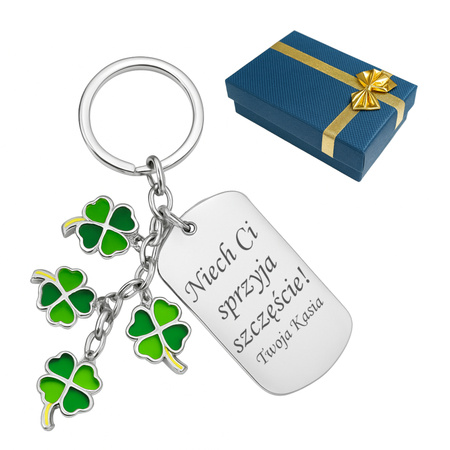 Brelok na klucze w kształcie nieśmiertelnika, do którego dodatkowo dołączone są 4 małe koniczynki na szczęście. Na zawieszce umieścimy dowolny grawer. Breloczek zapakowany w estetyczne pudełko prezentowe (kolor dobierany losowo - niebieski lub czerwony).