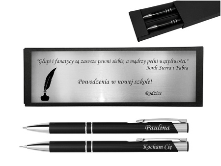 Zestaw piśmienniczy - długopis i ołówek mechaniczny w pudełku. Na długopisie i ołówku wykonamy dowolny grawer. Na tekturowym pudełku umieścimy tabliczkę z Twoim grawerem - dedykacja jest dowolna. Artykuły piśmiennicze w kolorze czarnym ze srebrnymi dodatkami.